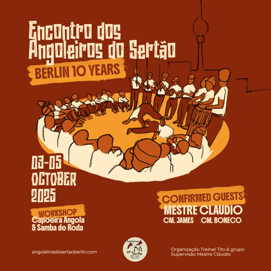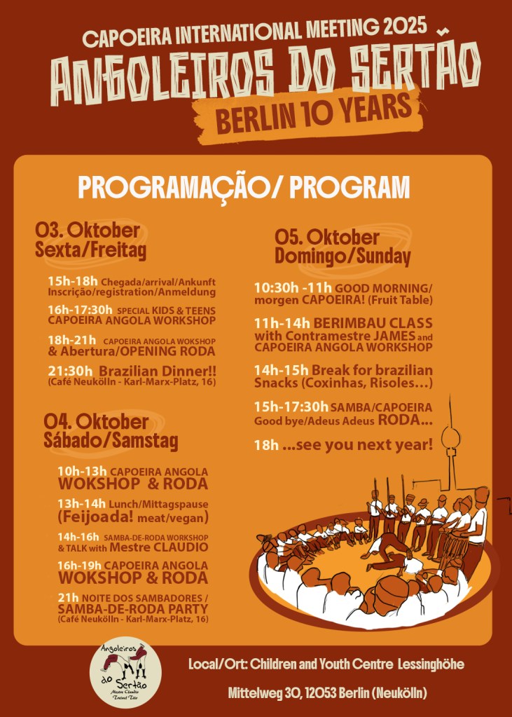 Em Outubro nós vamos celebrar 10 anos do nosso grupo em Berlim com a presença especial do Mestre Cláudio Costa (Bahia/Brasil), Contramestre James (SP/Brasil), Contramestre Boneco (Brighton/UK), Treinel Hulluca (Bahia/Brasil) e muitos outros convidados.